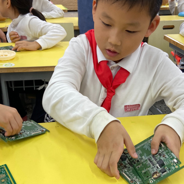 (小朋友認(rèn)真的觀察著機(jī)器人結(jié)構(gòu)件PCBA)